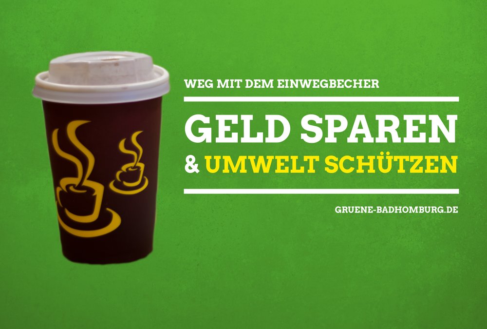 Die Bad Homburger GRÜNEN wollen den Kampf gegen den Müllberg aufnehmen und unterstützen dabei die Idee eines Belohnungssystems des hessischen Umweltministeriums, das von der GRÜNEN Umweltministerin Priska Hinz ins Leben gerufen wurde. Jeder Kunde der mit einem eigenen Mehrwegbecher kommt und damit zur Müllreduzierung beiträgt soll einen Preisnachlass von mindestens 10 Cent erhalten. „Der Kunde wird dafür belohnt, dass er die Umwelt schont und weniger belastet. Das ist eine Win-Win-Situation für Mensch und Natur“ freut sich der GRÜNE Unrath.